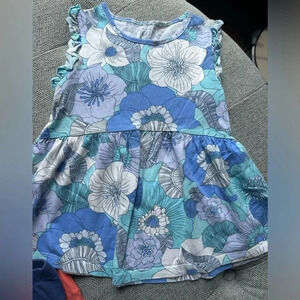 • Baby Gap dress: blue floral print, sleeveless with ruffle shoulders, peplum-style hem