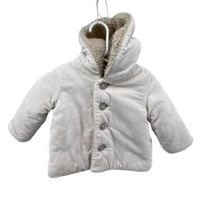 Baby Gap Size 0-6 Month Jacket Hooded Cream Beige Button Front Sherpa Style Lining. Gently used with no rips or stains. Please see photos. Cotton with polyester and acrylic lining.