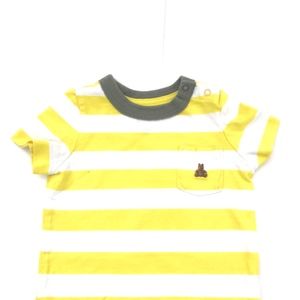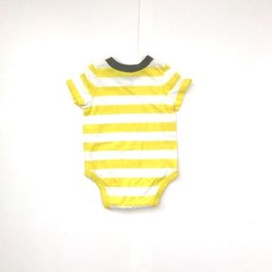 Like new condition, yellow and white striped bodysuit. Snaps at bottom and at neck. Olive green trim on collar. Embroidered teddy bear emblem.