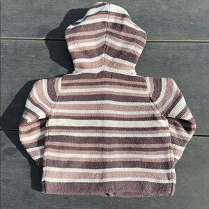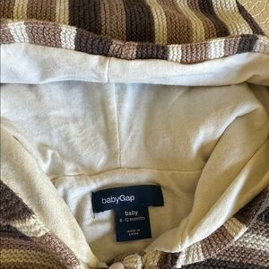 Charming GAP baby cardigan with hood. Features brown and cream stripes. Button closure for easy wear. Fully lined with soft cotton.