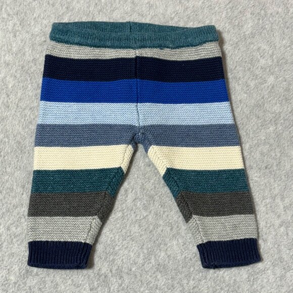 Soft and cozy striped knit sweater pants from Baby Gap designed for infants aged 0-3 months. Made from a durable cotton, these pants feature a multicolor pattern in shades of blue, gray, and cream. Ideal for keeping your baby comfortable throughout the day.