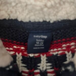 Navy, cream, Gray, and Red Baby Gap Holiday Sweater. Collar cream fleece-lined. Super soft and not scratchy.