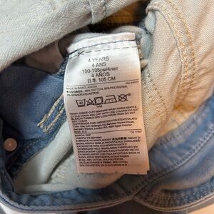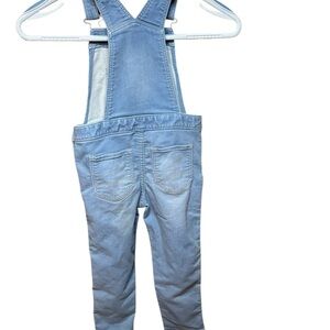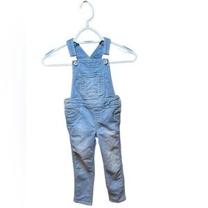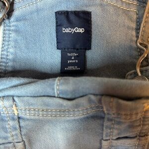 This is a pair of Gap toddler overalls in size 4T, designed for unisex babies and toddlers. The overalls are a stylish blue color and feature a classic overall style, making them a versatile and practical addition to a child's wardrobe. Made by Baby Gap, these overalls are sure to be comfortable and durable for young children on the move.