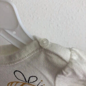 Creamy white puff sleeve bodysuit with bee graphic on front, linen blend skirt with attached diaper cover, pastel stripes, elastic waist, baby girl summer outfit.