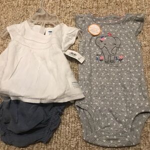 just one you Carter’s Elephant appliqué Heather gray and pink onesie new. Old Navy 2 piece white dress and matching diaper cover. New with Original tags.