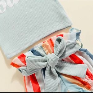 Baby Girl Summer 2 piece set. Sleevless ribbed tank with scoop neck. Bloomers have elastic waist and legs with a sassy tie bely yhay is removeable. Cotton Poly Blend so very breathable.
