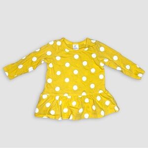 • Bright yellow long-sleeve peplum top with bold white polka dots – soft cotton, playful style. (6-9 months)