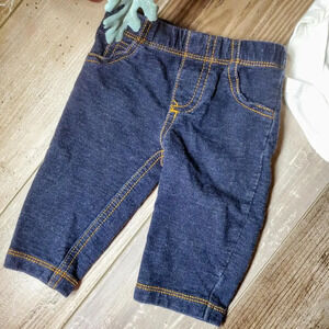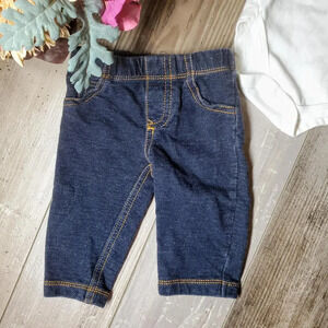 Bottoms are blue dark wash jeggings with elastic waistband and tan stitching - new without tags