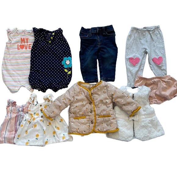 Baby Girl Bundle - 9 items, rompers, dresses, jeans, quilted jacket, 6-12mos.