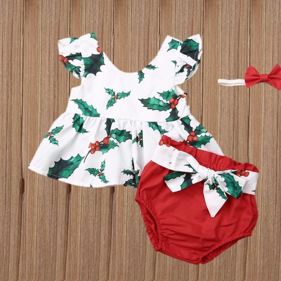 Baby Girl Christmas Outfit Clothes Dress Holly Berry Top Diaper Cover