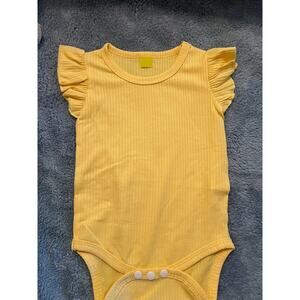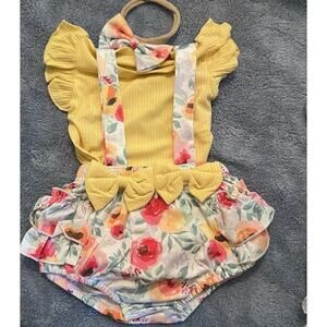 Dress up your little princess in this adorable Baby Girls Floral Romper! This one-piece outfit features a yellow top with flowered bottoms and a matching flowered bow. The short sleeve bodysuit is perfect for warmer weather, and the ruffled bottoms add a touch of playful style.
