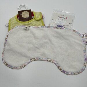 Three new items. Two Carter’s waterproof baby girl bibs (package says 3, there are two.) Two headbands by Munchkin and a terry cloth pima cotton bib/towel by Baby Gooroo. Perfect for a baby shower basket.
