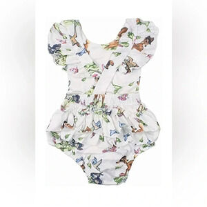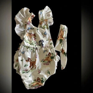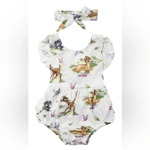 This super cute deer character ruffled sleeve sunsuit romper with self-tied headband