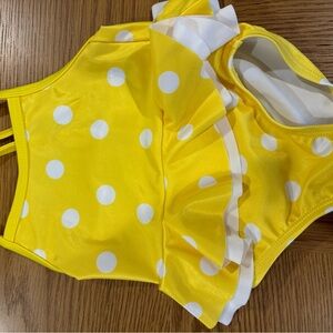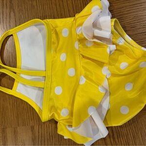 Three adorable baby girl bathing suits. Yellow polka dot is Gerber 3-6M very trendy. Pink and white floral print Green Sprouts 6M has button opened at bottom of suit for easy changing! Navy watermelon print Long-sleeved is Carters 9M very trendy print!