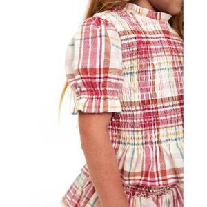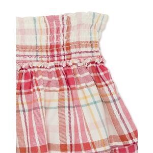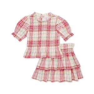 Material: 60% Cotton/40% Rayon • Care: Machine washable • Country of Origin: Imported • Set Includes: Top and skirt • Top features: Fitted; pullover style; back button closure with keyhole; smocked bodice; peplum hem; short sleeves with elasticized cuffs; allover print • Skirt features: Pull-on styling; smocked elastic waistband; tiered ruffle design; attached shorts for extra coverage; allover print