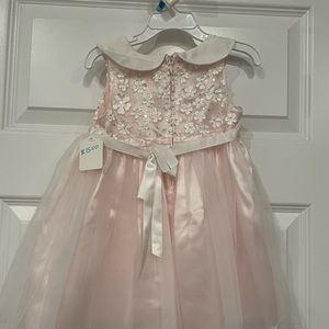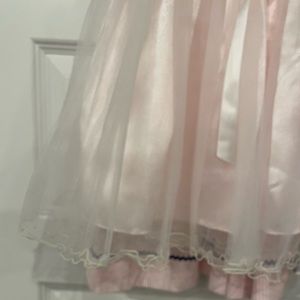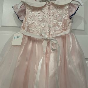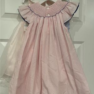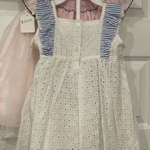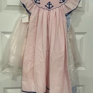 Special occasion dress is soft pink satin with tulle skirt, white daisy print on bodice, white collar, ribbon tie belt in back,zips, lined, built in petticoat, by Bonnie Baby, size 24M, like new; pink gingham seersucker nautical print smock is embellished with 3 royal blue anchors, flutter sleeves, by Carriage Boutique; casual sundress is white eyelet with light blue seersucker trim& matching panty, built in slip, by Belk’s Nursery Rhyme, size 24M, NWOT.