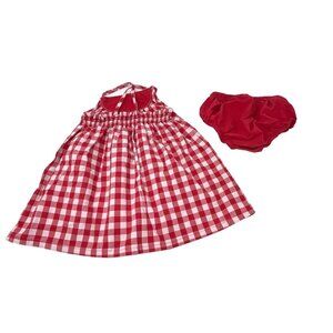 • Red & White Check Sundress with a Watermelon Slice at Neckline, Criss Cross Shoulder Straps, with Red Panties/Diaper Cover up