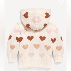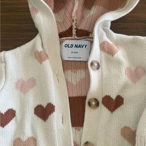 Adorable hooded cardigan with heart patterns. Features a button-up front and cozy hood.
