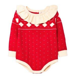 This charming baby girls' Christmas romper features a festive red and white design, complete with a ruffled collar. Crafted from soft cotton material, it ensures comfort and warmth for little ones. The snap closure makes dressing and diaper changes easy. A delightful addition to your little one's holiday wardrobe.