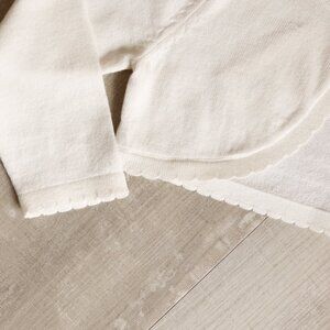 This Little Baby Girl's 100% Cotton Sweater is SUPER SOFT!! The sweater is done in a bolero/shrug style which keeps your little one warm without covering too much of their dress or tops underneath. The fly-away front has a scalloped hem as well as the sleeves. Super versatile and cozy! The super fine knit is so soft that it almost feels like Cashmere! Great for dresses or more casual wear! The perfect accessory!! New With Tags!