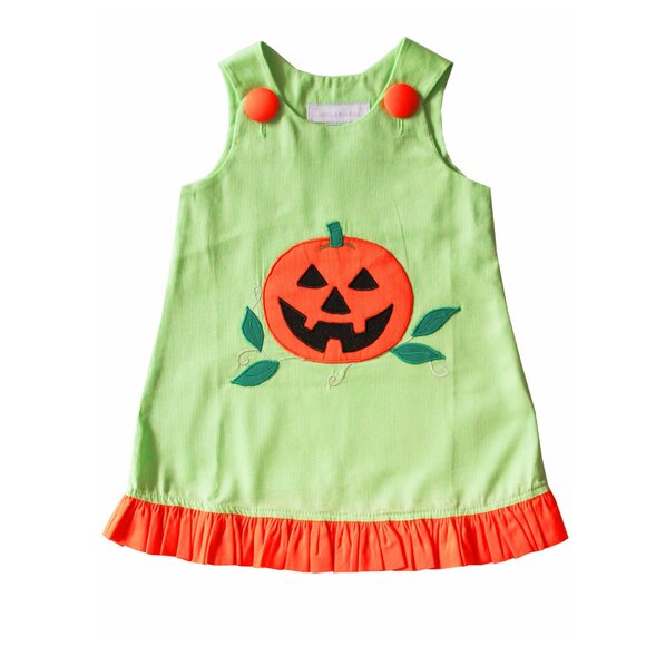 This Jack-o-lantern costume Halloween dress is beautifully made in green and orange 100% cotton fabric, perfect for those Halloween parties at school. Runs true to size.