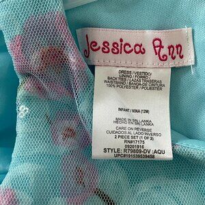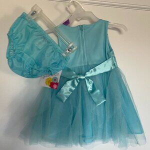 Adorable, sleeveless light blue dress with pink flowers on the top and a satin rosette waistband. Comes as a 2-piece set with matching light bloomers. My baby girl outgrew it before she could wear it!