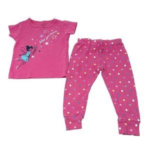 The Pink set has a solid pink short sleeve top with "follow your dreams" and Tinkerbell & stars on it. The bottoms have dots in yellow, lavender, turquoise, and white. They are 100% soft cotton.