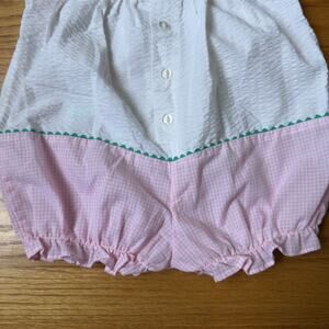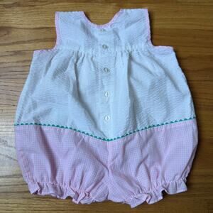 Baby Girl's Pink & White Seersucker Romper Bow Accent Embroidered Flowers