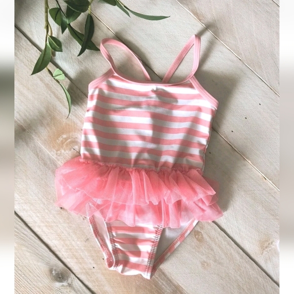 Baby Girls Pink White Striped Ruffle One Piece Bathing Suit Size 6-9 Months