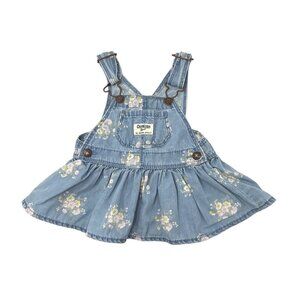 • Light Blue Jumper with Floral Print in Muted Colors of Pink, Yellow, & White, Straps have Metal Hooks & Buttons, Metal Buttons on Each Side at Waist, Pocket on the Bib with "OshKosh B'Gosh on it