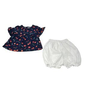 • Navy Dress with a Design of Red Cherries with Green Leaves, White Bloomers with Elastic Waist with Ruffles at Legs