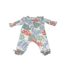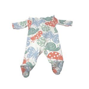 • White Sleeper with Butterfly, Ladybug, & Snail Desgin in Blue, Green, & Orange with ruffles at the Shoulders, Zips Up and Down the Front