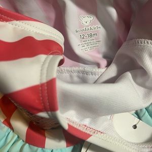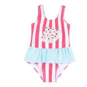 A ruffle at the waist adds a playful attitude to our koala kids striped swimsuit. Perfectly stretchy in nylon/spandex, this swimsuit features wide straps, vertical stripes, a scoop neckline, and a fun watermelon print on the chest. It's perfect for.