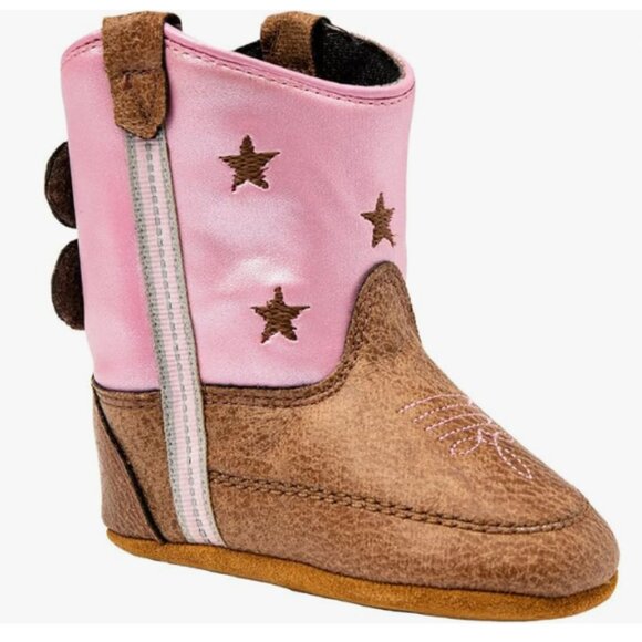 Adorable slip on booties for your Country cutie in a pretty pink with brown accents and stars. These were purchased at BB and are new in packaging. I have size 2 and 4 available. Please check the size chart and ask any questions you may have. Thank you!
