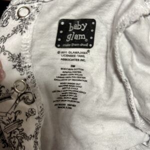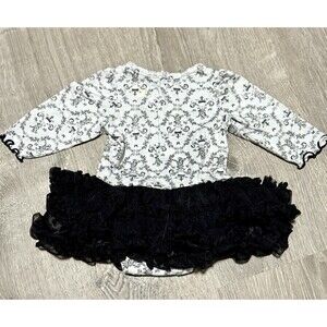 Adorable Baby Glam romper in size 3M featuring a gothic-inspired black and white damask print top with a layered black tutu skirt and satin bow. Soft cotton body with comfortable stretch and snap closures at the back and bottom for easy changes. Perfect for photos, parties, or special occasions.