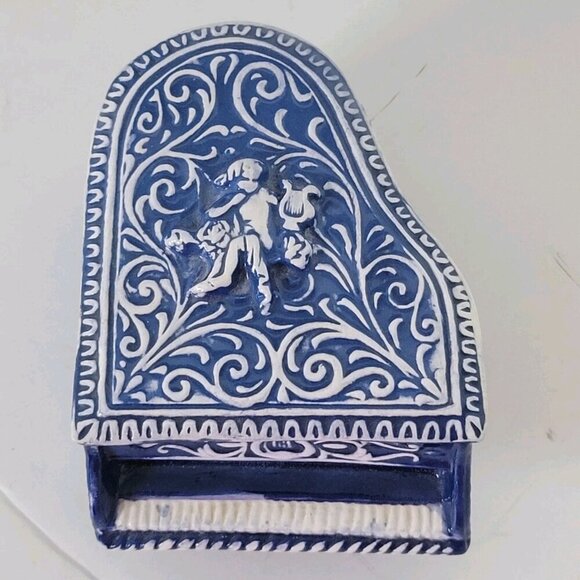 The Baby Grand Piano Trinket Box is a unique and handmade ceramic piece, created in the in 1972 by Janet Williamson. The blue and white color scheme adds a touch of elegance to this trinket box, making it a charming collectible for those who appreciate fine craftsmanship and vintage pieces. With its marked design and intricate details, this piano trinket box is a one-of-a-kind item that would make a lovely addition to any vanity or dressing table.