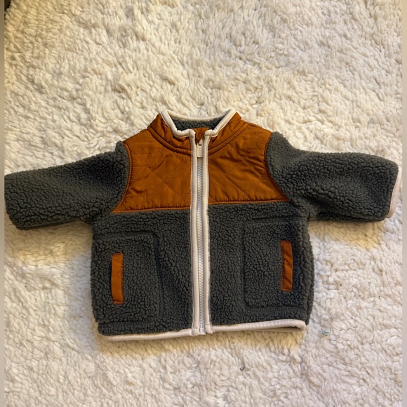 Soft gray sherpa baby jacket with rust orange quilted and pocket accents. Front zipper closure. Warm and stylish layer for everyday wear.