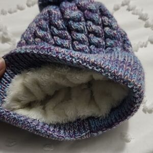 Keep your little one extra cozy and cute in this super-soft knit beanie! This hat features a vibrant blend of purple, blue, and cream tones, a playful pom-pom on top, and a warm fuzzy fleece lining. The fold-over cuff includes a cheerful smiley face patch for added charm.