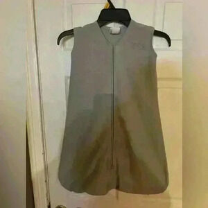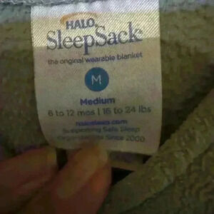 Preowned condition: one medium size Halo sleepsack greyish in color. One blue and white striped baby blanket. They have no rips, stains, or tears.