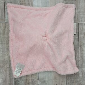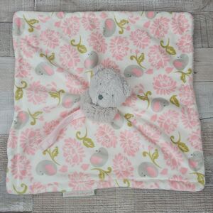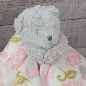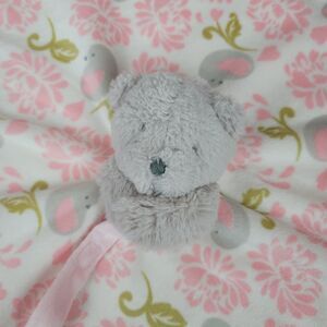 Soft and sweet baby bear lovey security blanket. Gray bear plush surrounded by soft pink, gray and green floral/bird print has a pacifier strap and reverses to solid pink. So so cute and ready to comfort baby! In good preowned condition; measures approximately 15 inches x 15.5 inches.