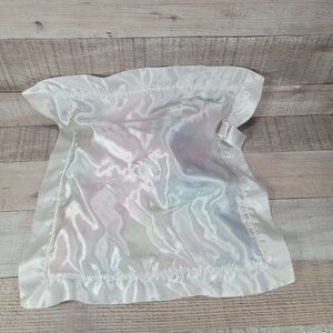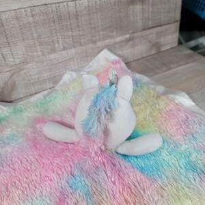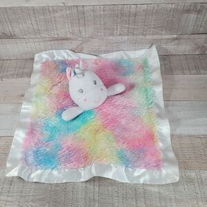 Unicorn plush baby lovey sits among a rainbow of colors with a tie dye look. This comfort security blanket measures approximately 13.5" x 13" and has a shiny solid color satin back. Lovie is in good gently loved condition; silver color on horn mostly gone from washing and a few minor picks/pulls on satin .. photos provided.