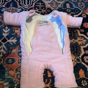These suits really do work like magic! They are a patented swaddle transition product designed by a pediatric physical therapist. Intended for back sleeping. $40 for both or $25 each. Worn by both of our babies, but clean, smoke-free home. Organic, fragrance-free detergent used.
