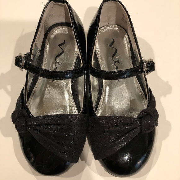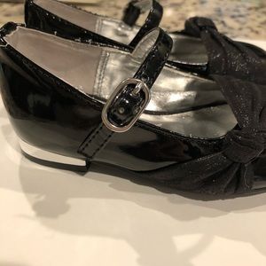 Great condition. Black patent shoes with glitter fabric detail, and silver plated detail on the heels. True buckle.