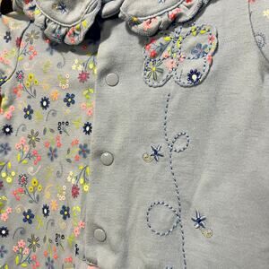 Adorable Okie Dokie baby blue knit jumper in size 0-3 months. This sweet one-piece features delicate embroidery on one side and a charming screen-printed floral design on the other. Perfect for keeping your little one cozy and stylish! It also has a cute ruffle collar.