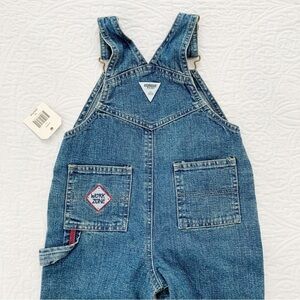 OshKosh denim overalls with construction-themed embroidery on rolled cuffs and back pocket. Snap inseam.
