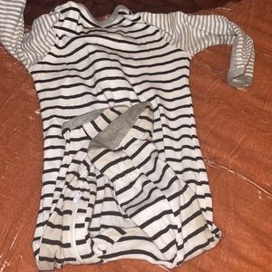 Black white and grey pajama onesie. Zipper starts at the door and goes up. Good for changing baby in the middle of the night. Comes from smoke and pet free environment. Has some stains as shown in photos