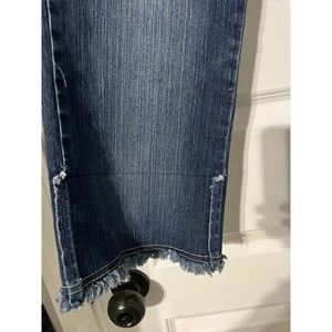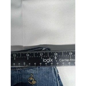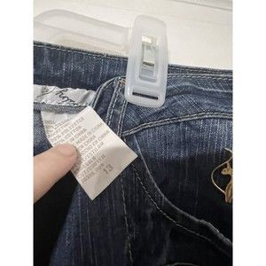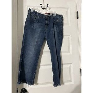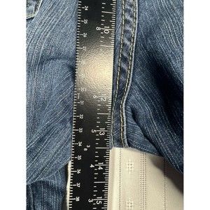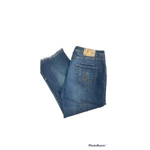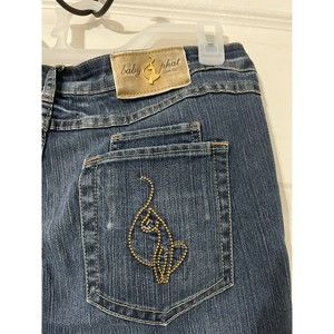 Baby Phat Capri Jeans Womens 13 Stretchy Cat Embroidered Logo Gold. Looks like someone took off the cuffed part of the Jean off, underneath has some staining. Small white stain on pants, gold part of the label is rubbing off, . Otherwise good condition, measures to a size 35 waist when laid flat
