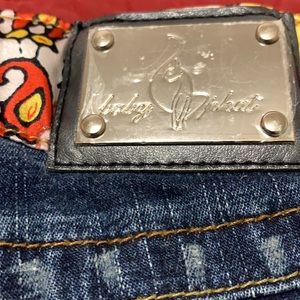 Baby Phat medium wash women’s long Bermuda shorts with embellished waistband.These shorts have not been worn and the protective covering is still on the metal tag on the back pocket (see photo.)