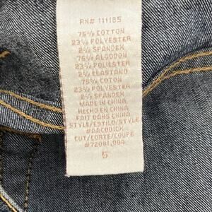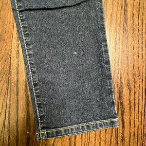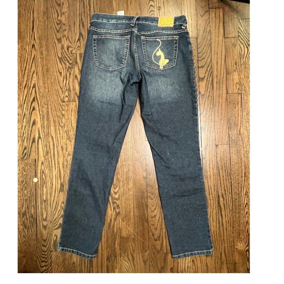 Baby Phat dark wash, mid-rise jeans with a straight or cropped leg fit featuring a signature gold embroidered with rhinestones on the back pocket Size: 5
