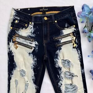 NWOT. Distressed Skinny Jeans for Juniors/Women 5/6. Gold Zipper and button for closure, 5 pockets design, 4 gold faux zippers front for style only with dangling "Baby Phat" brand logo, embroidered brand logo back right pocket, mix of dark wash and stone wash rinse, has loops. Please note, there is no internal material/care tag. Pictures are part of description.
